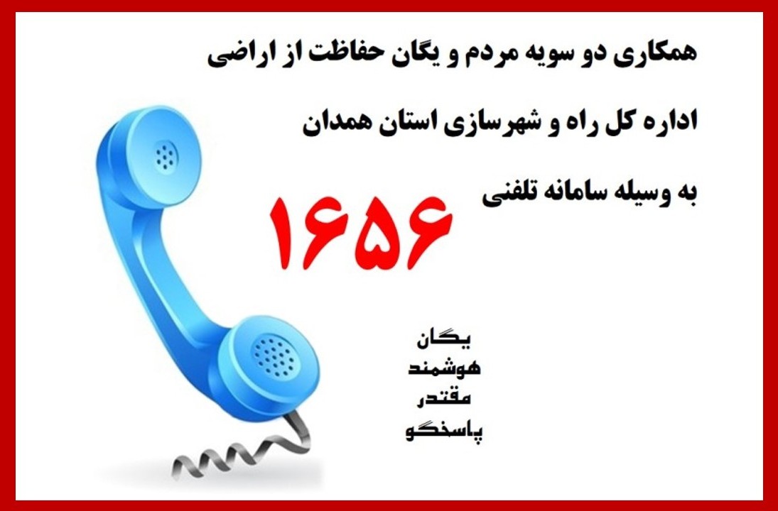 به گزارش اداره ارتباطات و اطلاع رسانی اداره کل راه و شهرسازی استان همدان، " داریوش حسینی" راهاندازی سامانه ۱۶۵۶ را همیار خوب مردمی برای کمک به دولت در جلوگیری از هرگونه تعرض به اراضی دولتی و زمینخواری در سطح استان همدان دانست.