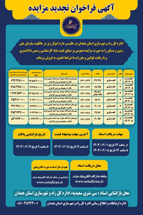 •  آگهي مزايده عمومي اراضی تجاری راه و شهرسازی در اسدآباد