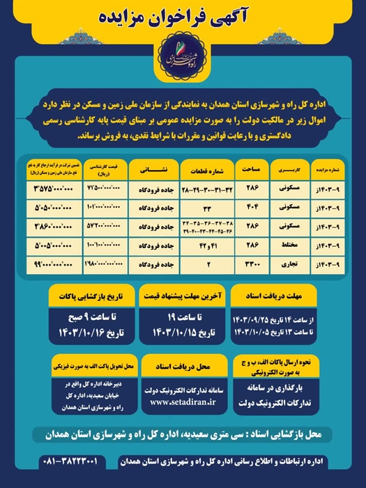 به گزارش پایگاه خبری راه و شهرسازی (همدان)، اداره کل راه و شهرسازی استان همدان در نظر دارد اموال زیر در مالکیت دولت را به صورت مزایده عمومی بر مبنای قیمت پایه کارشناسی رسمی دادگستری و با رعایت قوانین و مقررات با شرایط نقدی، به فروش برساند.