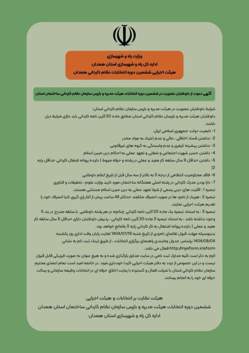 آگهی دعوت از عضویت در ششمین دوره انتخابات هیئت مدیره و‌بازرس سازمان نظام کاردانی ساختمان استان همدان