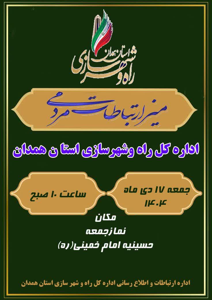 به گزارش اداره ارتباطات و اطلاع رسانی اداره کل راه و شهرسازی استان همدان، سیده مهسا موسوی پاک نهاد، رئیس اداره ارتباطات و اطلاع رسانی راه و شهرسازی همدان از برپایی میز ارتباط مردمی این اداره کل با هدف پاسخگویی به شهروندان گرامی در حوزه فعالیت اداره کل راه و شهرسازی استان در نماز جمعه همدان جمعه مورخ ۱۷ دی ماه ۱۴۰۴ ساعت ۱۰ صبح خبر داد.
